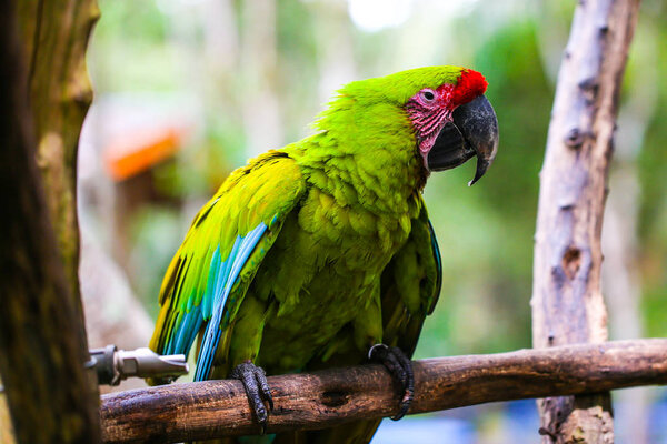 827961090 A green exotic parrot sitting on a tree branch, close-up