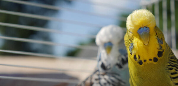 736961280 Close-up of two budgerigars inside a cage, with the focus on a yellow parakeet in the foreground and a blue and white parakeet in the background. The vibrant colors of the birds contrast with the