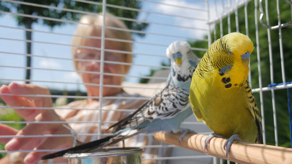 740427528 A woman is seen admiring her cute pets, a pair of Czech budgerigars, inside their cage. The colorful parakeets are perched and interacting, while the woman watches them lovingly, highlighting the bond