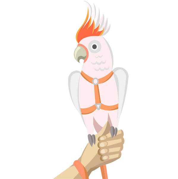 660538052 Pink cockatoo; galah; pink and grey cockatoo or rose-breasted cockatoo parrot in harness and leash on human hand - vector illustration