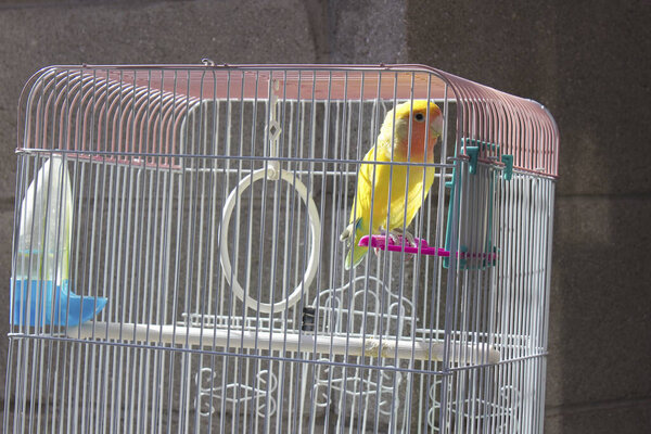 742394616 Funny Yellow gray cockatiel parrot sits in a cage at home