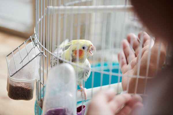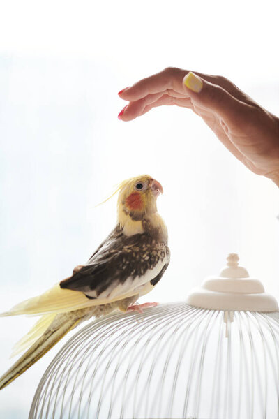 742393864 Portrait of Funny Yellow gray cockatiel parrot and his owner woman at home