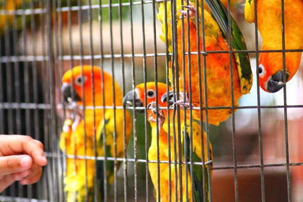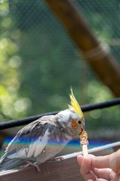 606459074 Nymphicus hollandicus, young woman giving food to a bird, grains stuck on a wooden stick and the bird fed, mexico, guadalajara