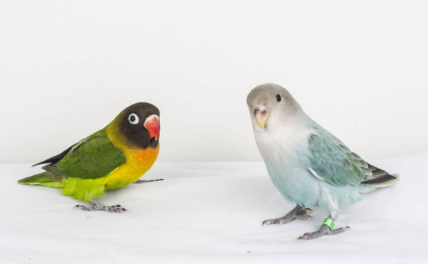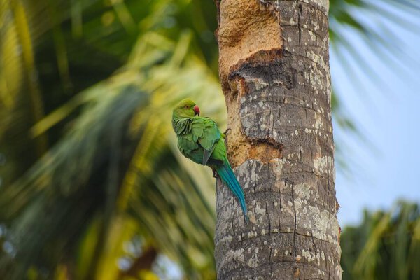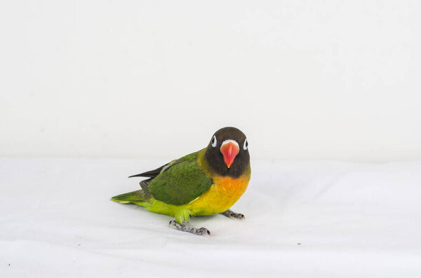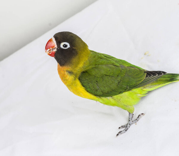 648563128 Rosy-faced lovebird parrot bird is sitting on a branch and building a nest. Peach, red, rose and green color. Beautiful animal.