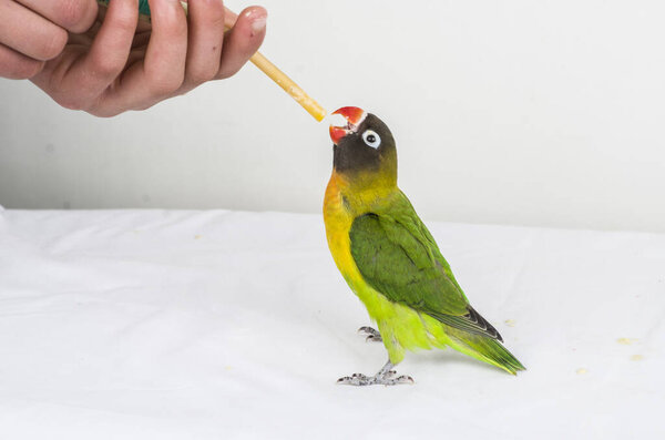 606459182 Nymphicus hollandicus, young woman giving food to a bird, grains stuck on a wooden stick and the bird fed, mexico, guadalajara