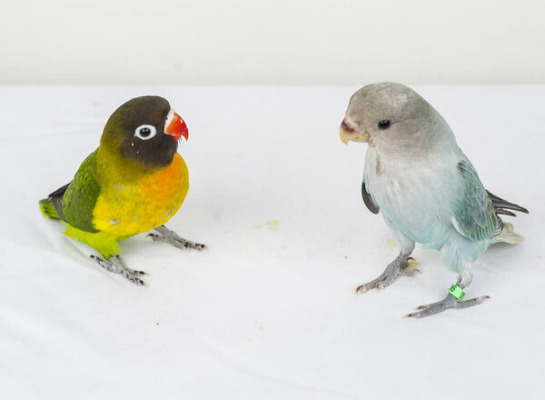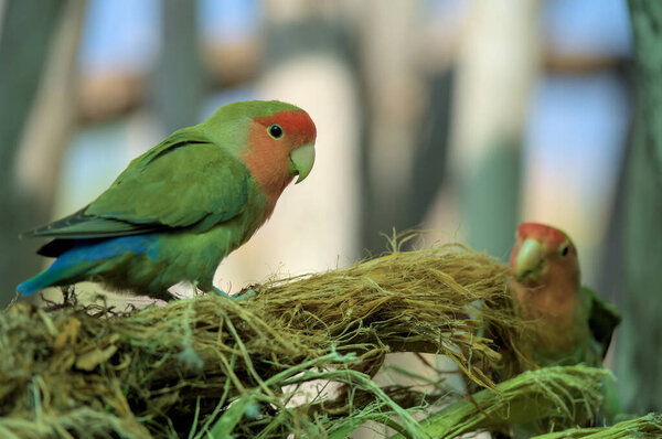 649650978 Rosy-faced lovebird parrot bird is sitting on a branch and building a nest. Peach, red, rose and green color. Beautiful animal.