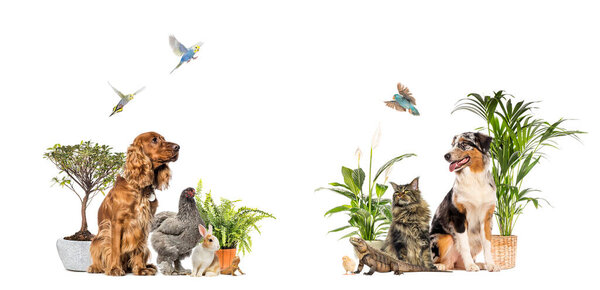 837440596 Group of common pets like dogs, cats, birds, reptiles, a rabbit, and a chicken sitting around houseplants with parakeets flying above, with plants