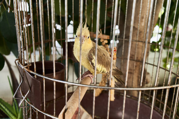 730951646 A yellow cockatiel perched inside a birdcage with a brown feed cup, set against a blurred green plant background.