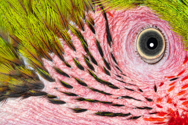 639483442 Macro head shot of a Great green macaw bird, details on eyes and small feathers, Ara ambiguus, Isolated on white