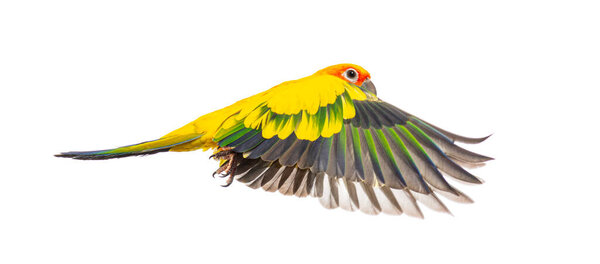 707265422 Sun parakeet bird, Aratinga solstitialis, flying wings spread, isolated on white