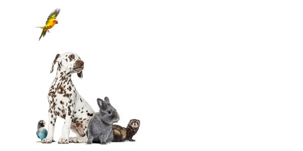 675855886 Group of pets posing around dogs and cats; dog, cat, ferret, rabbit, bird, fish, rodent, isolated on white