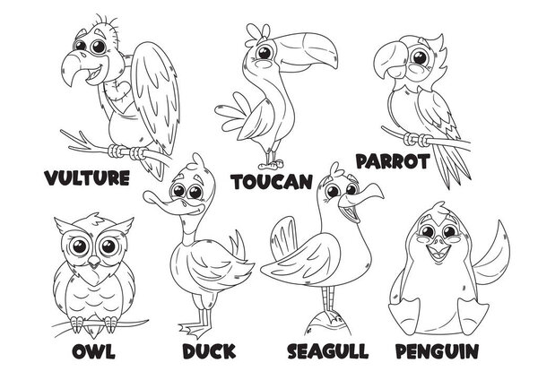 697934208 Outline Cartoon Funny Bird Characters Monochrome Icons Set. Vulture, Toucan, Parrot and Owl, Duck, Seagull or Penguin Cute Avian Personages for Kids Coloring Book or Game. Vector Illustration