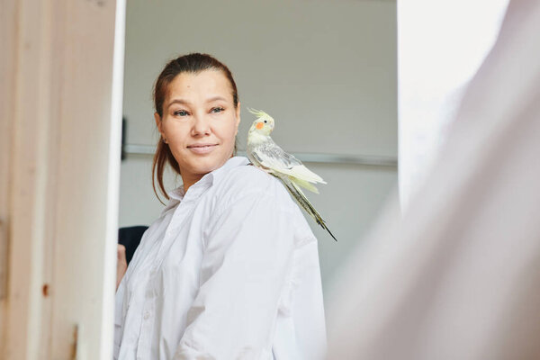 742393864 Portrait of Funny Yellow gray cockatiel parrot and his owner woman at home
