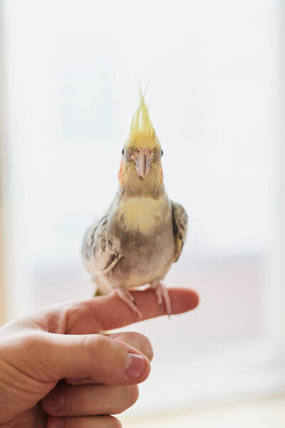 742394748 Portrait of Funny Yellow gray cockatiel parrot and his owner woman at home
