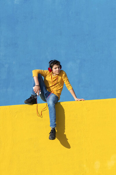 281164676 Front view of a young boy wearing casual clothes sitting on a yellow fence against a blue wall while using a mobile phone to listening music