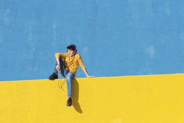 281164682 Front view of a young boy wearing casual clothes sitting on a yellow fence against a blue wall while using a mobile phone to listening music