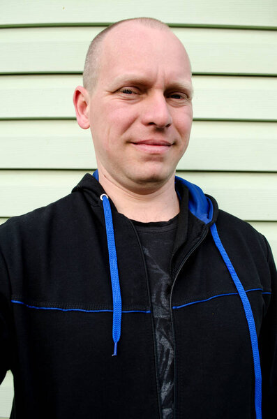 843736832 Casual smiling bald man wearing dark hoodie standing outdoors near vinyl siding