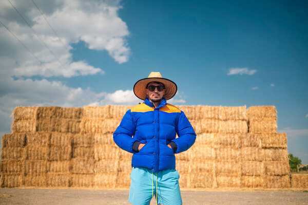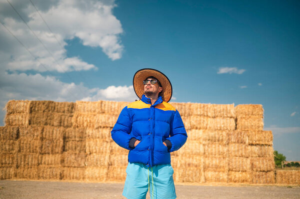 839299494 Stylish man wearing hat and blue puffer jacket