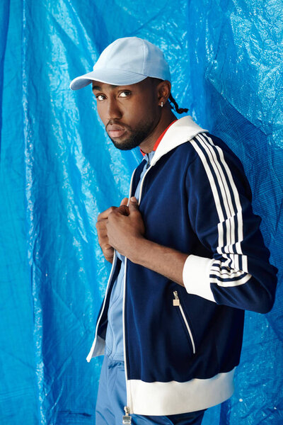 834430004 A confident young man showcases his unique style in sporty clothing with a striking blue backdrop.