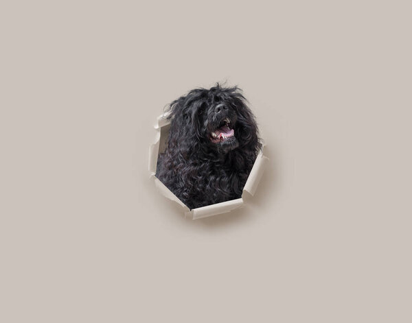 838467266 Happy dog coming out of a torn paper hole, Portuguese Water Dog breed
