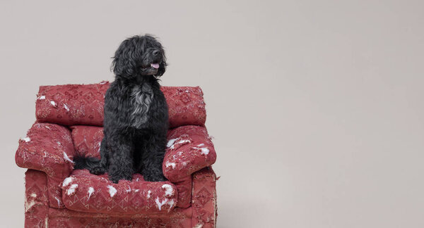 838468340 Cute large hairy dog sitting on a ripped armchair, Cao de Agua dog breed, pet lifestyle concept, copy space