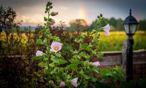 656131846 Cherry blossoms in the city square in the city of Khmelnytskyi. Flag of Ukraine