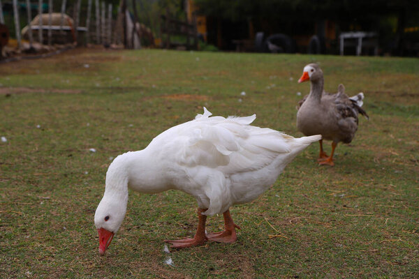 712889184 Pair of geese walking free on a farm. Poultry. White goose and gray goose with farm background and copy space. Farm animals.