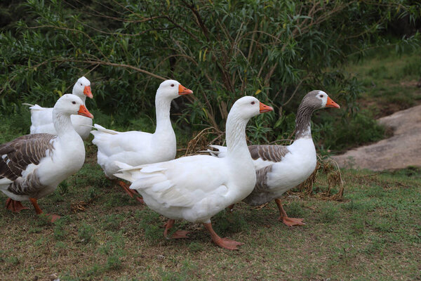 722122490 Group of geese walking free on rural farm. Row of geese. Farm animals. Domestic birds. Poultry industry.