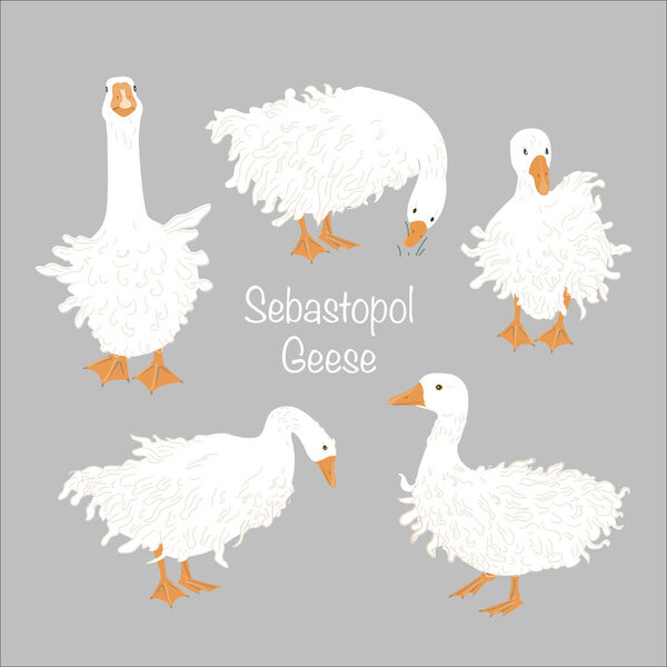634283862 Cute Sebastopol goose set. Cartoon vector collection isolated on grey background