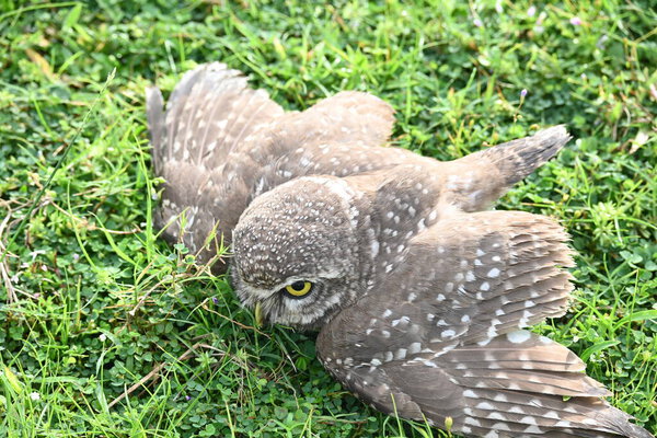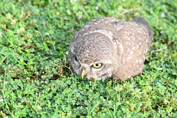 847937112 Spotted owlet or Athene brama owlet. It is a small owl which breeds in tropical Asia from Southeast Asia. This is a roost in small groups in the hollows of trees or in cavities in rocks and buildings.