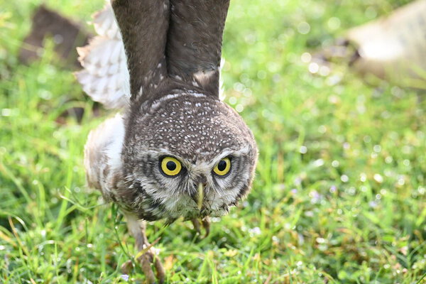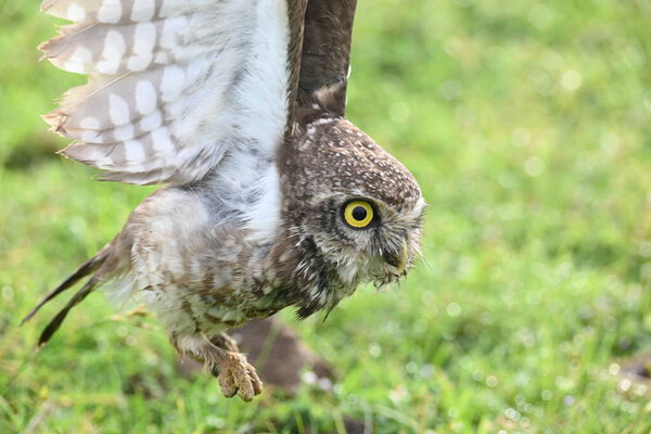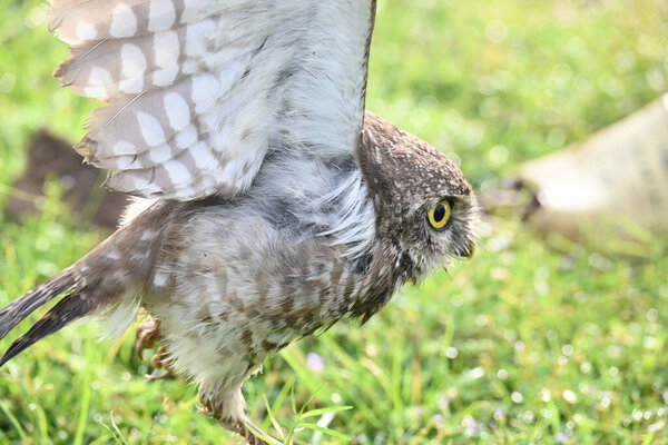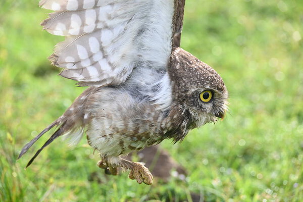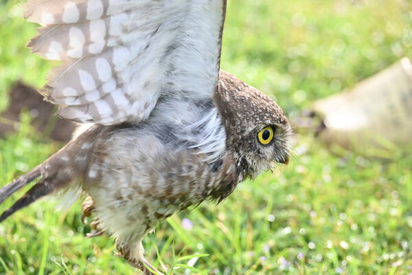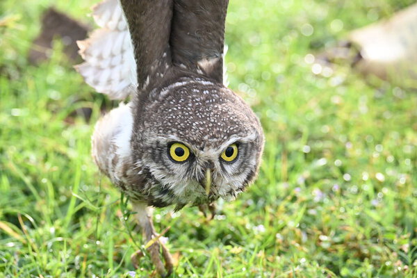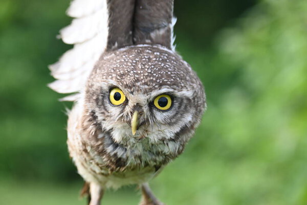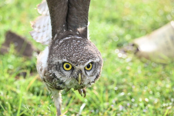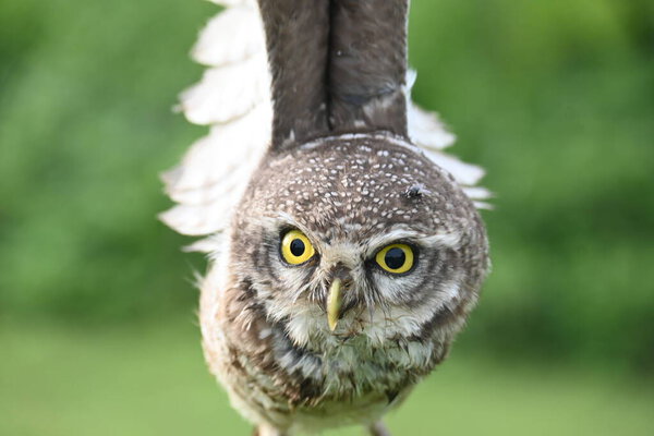 708687112 Spotted Owlet Athene brama in low flight in Ranthambore tiger reserve, India