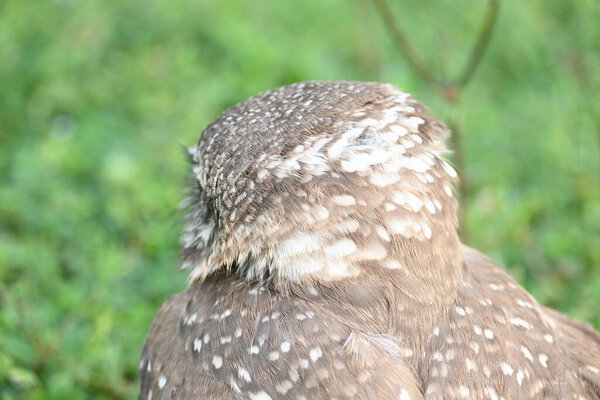 593639338 A closeup of a cute spotted owl (Strix occidentalis) sleeping on a tree and basking
