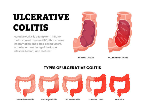 536666296 Types of ulcerative colitis, gut disease. Variants of UC, from proctitis involving just rectum to pancolitis with Inflammation of entire colon. Medical vector illustration for healthcare leaflet.