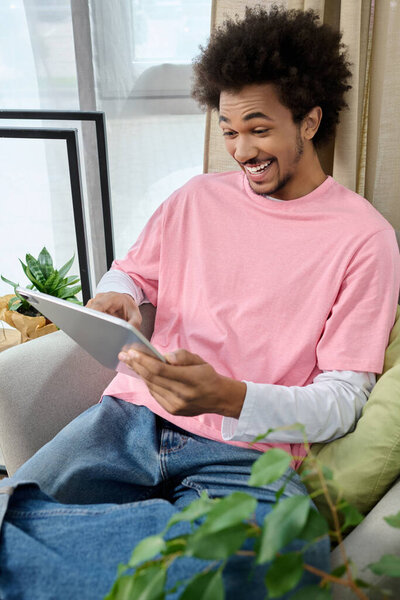 866936616 Handsome young man smiles brightly while using a tablet in a stylish, comfortable setting.