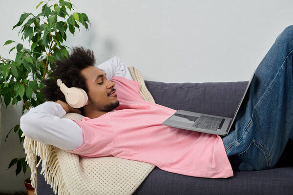 866936718 A handsome young man lounges on a couch, wearing headphones while using his laptop.