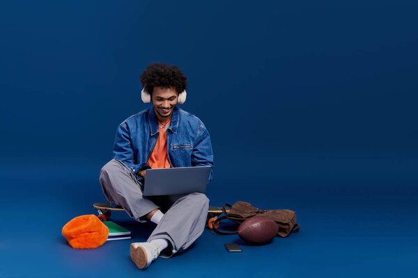 866938768 Focused young man smiles while using his laptop, surrounded by casual items on the floor.