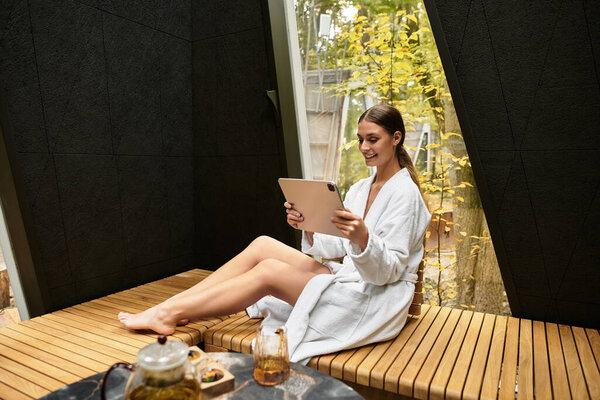 852687716 Young woman in a soft bathrobe relaxes peacefully while using her tablet in a spa setting.