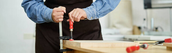865741686 In a lively workshop, a beautiful young woman focuses on woodworking, skillfully using tools.