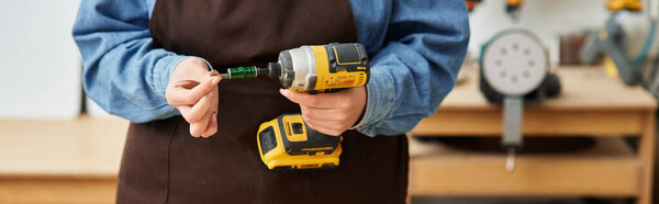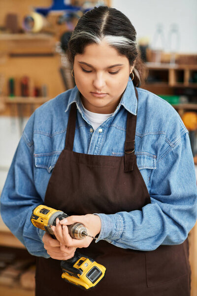 865743460 Bright and cheerful young woman explores her skills at a workshop, using power tools creatively.