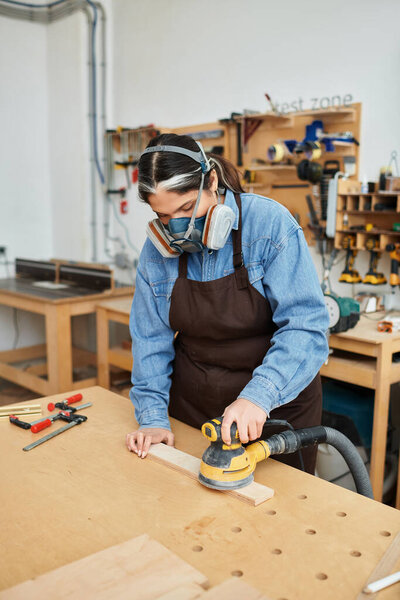 865743814 A young woman focused on her work, skillfully using a power sander in a creative workshop.
