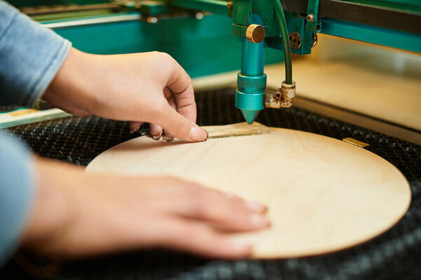 865744852 Young woman skillfully works on a crafting project using a precision machine in an elegant workshop.