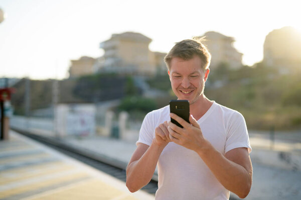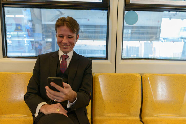 144386787 Happy businessman smiling and using mobile phone inside the train