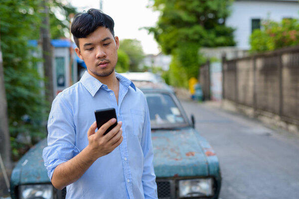 223673578 Portrait of young Asian businessman using mobile phone against rusty old car in the streets outdoors