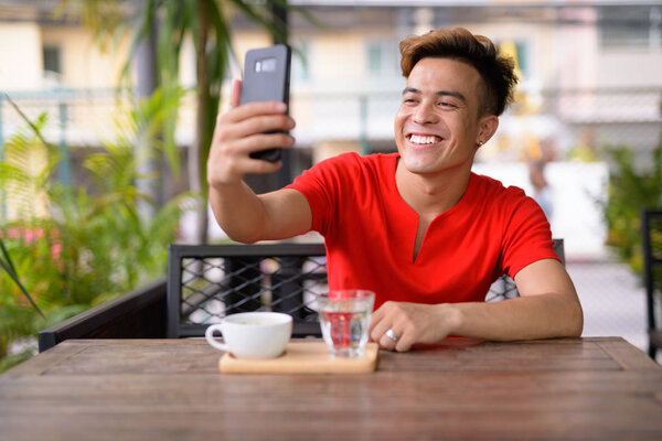 237478946 Portrait of young Asian man at the coffee shop outdoors