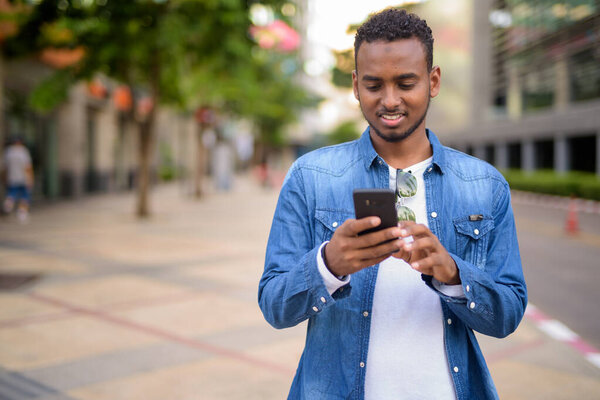 314355670 Portrait of young handsome African bearded man with Afro hair exploring the city streets outdoors