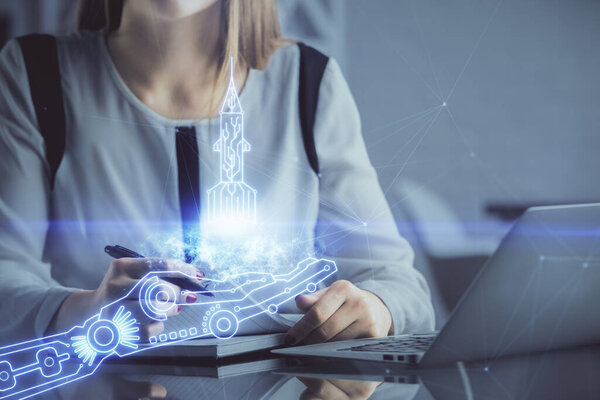 657148988 Double exposure of woman hands typing on computer and creative drawing. Start up concept.
