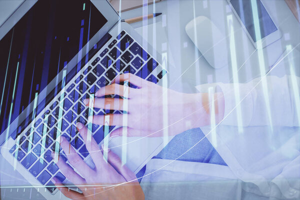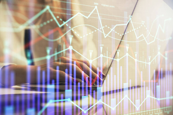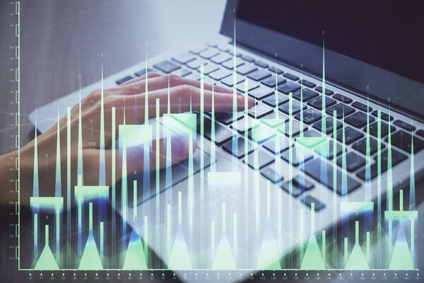 662704788 Double exposure of woman hands typing on computer and forex chart hologram drawing. Stock market analysis concept.