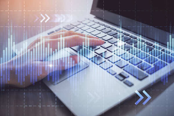 668058412 Double exposure of woman hands working on computer and forex chart hologram drawing. Top View. Financial analysis concept.
