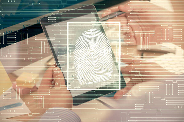666920744 Double exposure of man's hands holding and using a digital device and fingerprint hologram drawing. Security concept.
