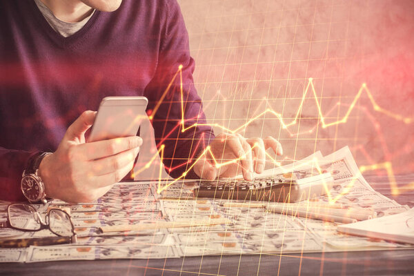 677812662 Double exposure of man's hands holding and using a digital device and forex graph drawing. Financial market concept.